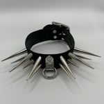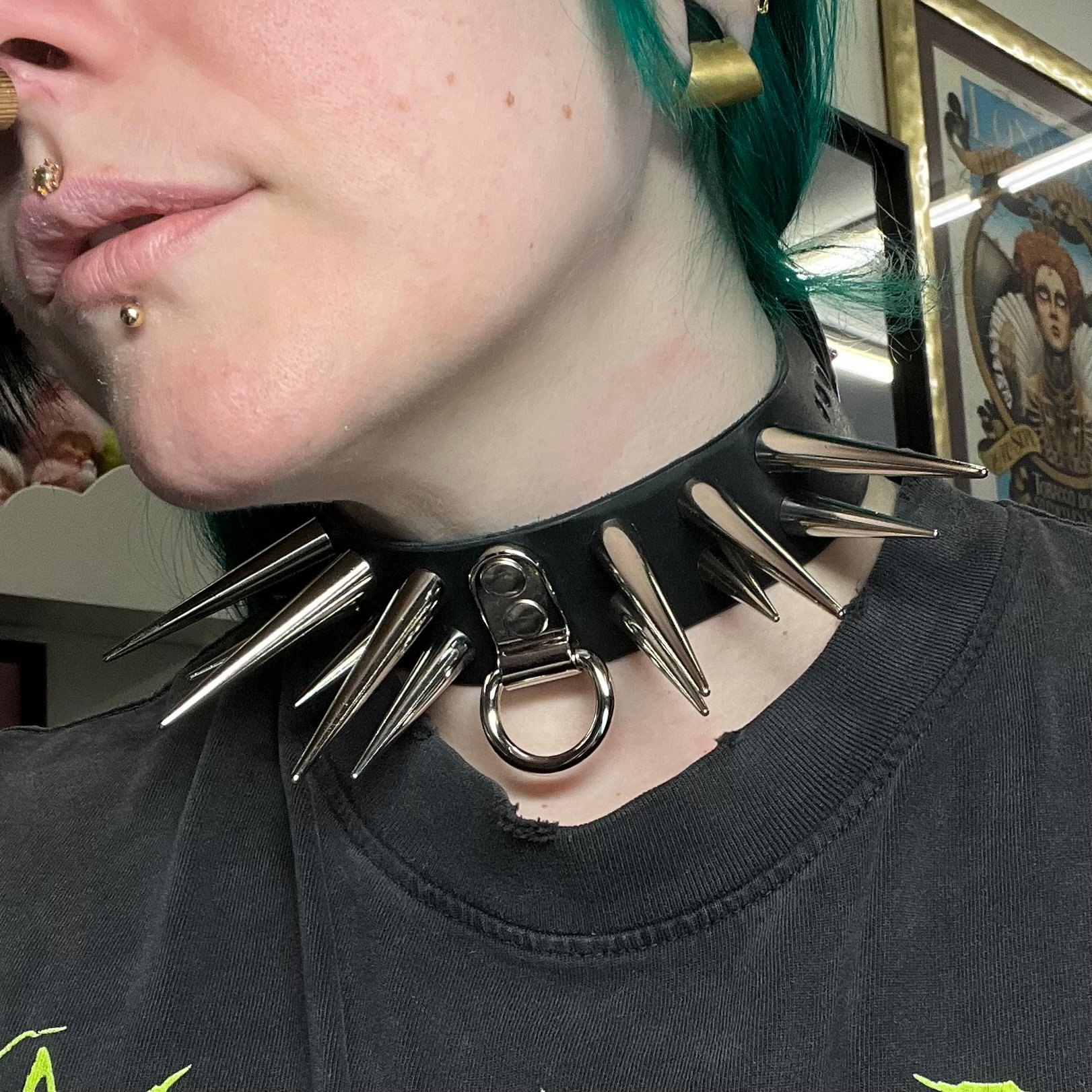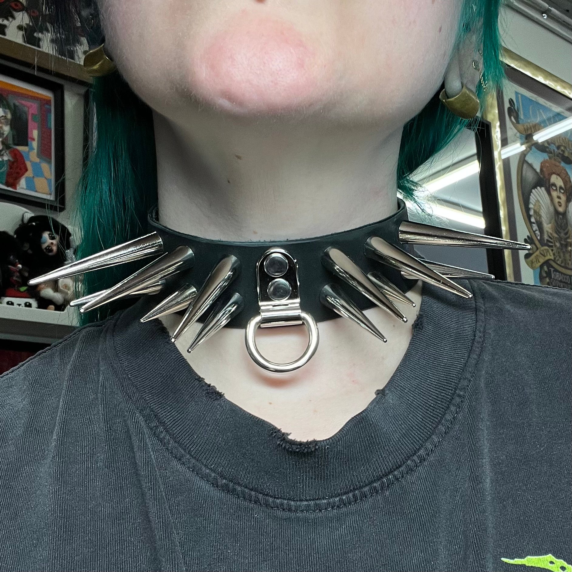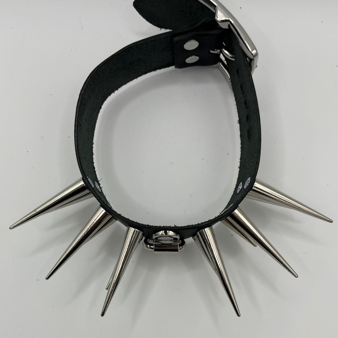 Handmade leather collar. Super spikey d ring in the middle. 1.5” in height. Same height around the entire collar. PLEASE NOTE the back of this collar will belt more at the side on the smaller holes. I think it looks sassy hahaha. All collars are strong enough for play.